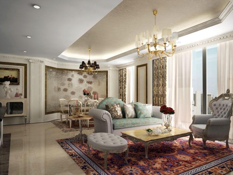 Vì các đồ nội thất mang phong cách cổ điển đều khá đồ sộ, cồng kềnh nên việc bố trí cũng cần có kinh nghiệm. Tất cả những điều này đều sẽ được các kiến trúc sư sắp xếp đảm bảo sự hài hòa và liên kết. Cụ thể, bàn ghế sẽ được đặt ở trung tâm phòng khách, phía trên chính giữa sẽ là đèn chùm. Xung quanh tường có thể nhấn nhá thêm các loại đèn tường với kiểu hình nến hoặc thiết kế hài hòa cùng đèn chùm.