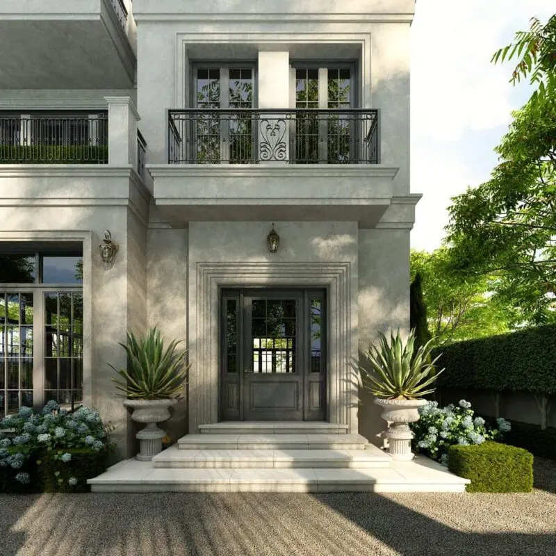 Thiết kế biệt thự Vinhomes Riverside tân cổ điển sẽ giúp gia chủ có chất sống đẳng cấp, sang trọng bởi gam màu trắng sáng thanh lịch. Những hoạ tiết, hoa văn tinh xảo được bố trí khéo léo tại tường rào, cửa sổ và cổng chính,… đã tạo ra tổng thể khác biệt cho biệt thự của gia chủ.
