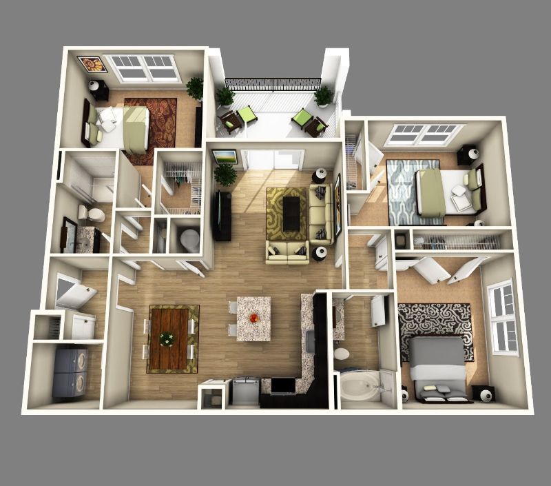 Mẫu thiết kế căn hộ có 3 phòng ngủ đầu tiên mà chúng tôi muốn giới thiệu chính là kiểu hiện đại khép kín. Qua hình ảnh tổng thể về căn hộ có thể thấy, mỗi một phòng ngủ đều có 1 phòng WC và thay đồ. Điều này giúp mang đến sự riêng tư cho mỗi thành viên ở trong phòng ngủ đó. Đặc biệt, cả 3 phòng ngủ còn được thiết kế với ban cộng rất thoáng và rộng mang đến ánh sáng và gió tự nhiên.