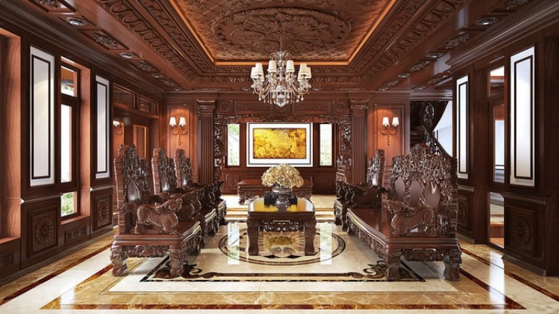 Đối với mẫu phòng khách biệt thự bằng gỗ tự nhiên đắt đỏ này sẽ cho thấy giá trị tương xứng đẳng cấp của căn biệt thự. Từng chi tiết đường nét, nền trần thạch cao và sử dụng chất liệu gỗ chủ yếu sẽ tạo cảm giác ấm cúng, sang trọng, bền bỉ với thời gian.